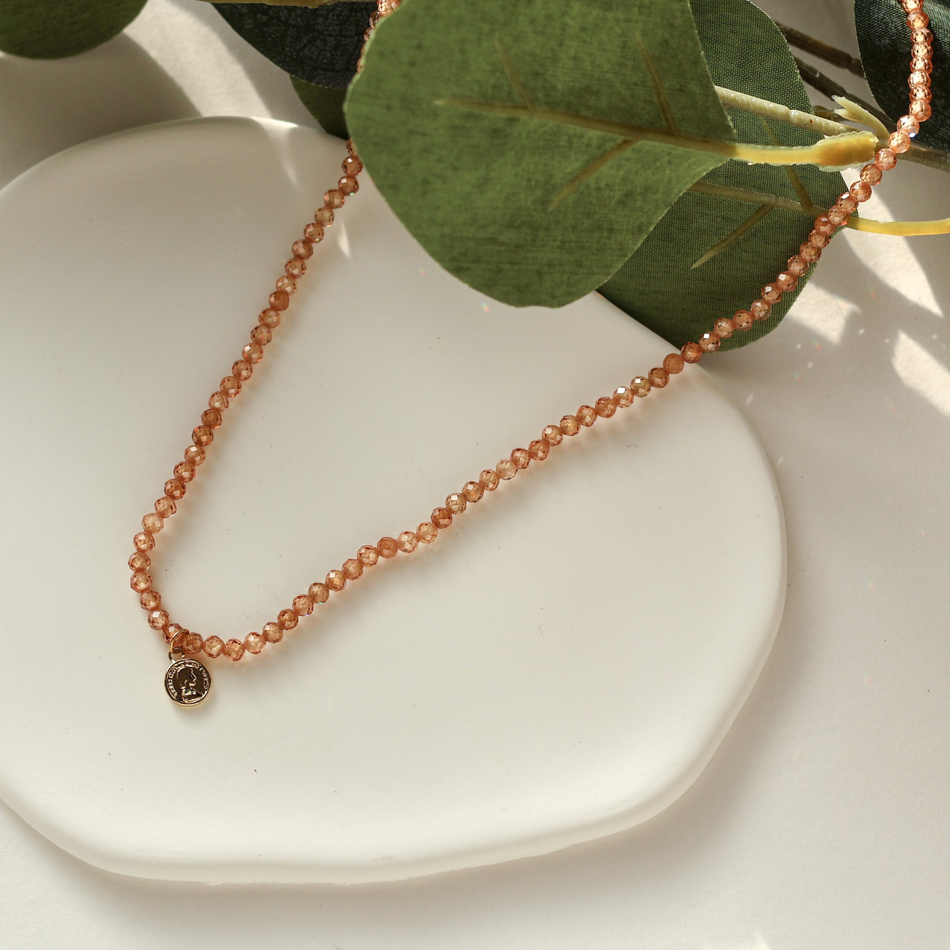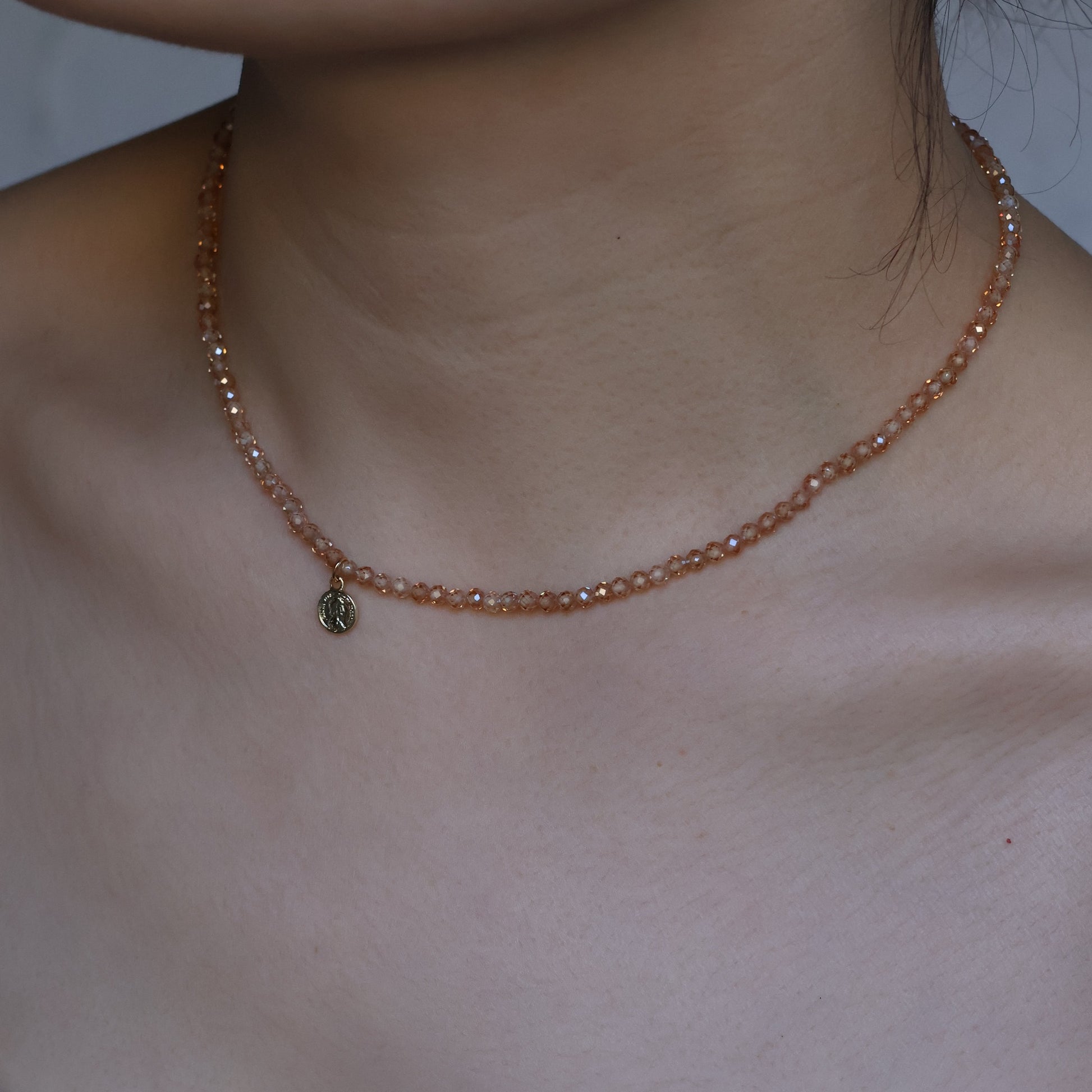 An exquisite handmade necklace that captivates with its warm and alluring essence. It features a stunning array of amber-colored cubic zirconia beads meticulously crafted to resemble sweet and delectable hard candies.