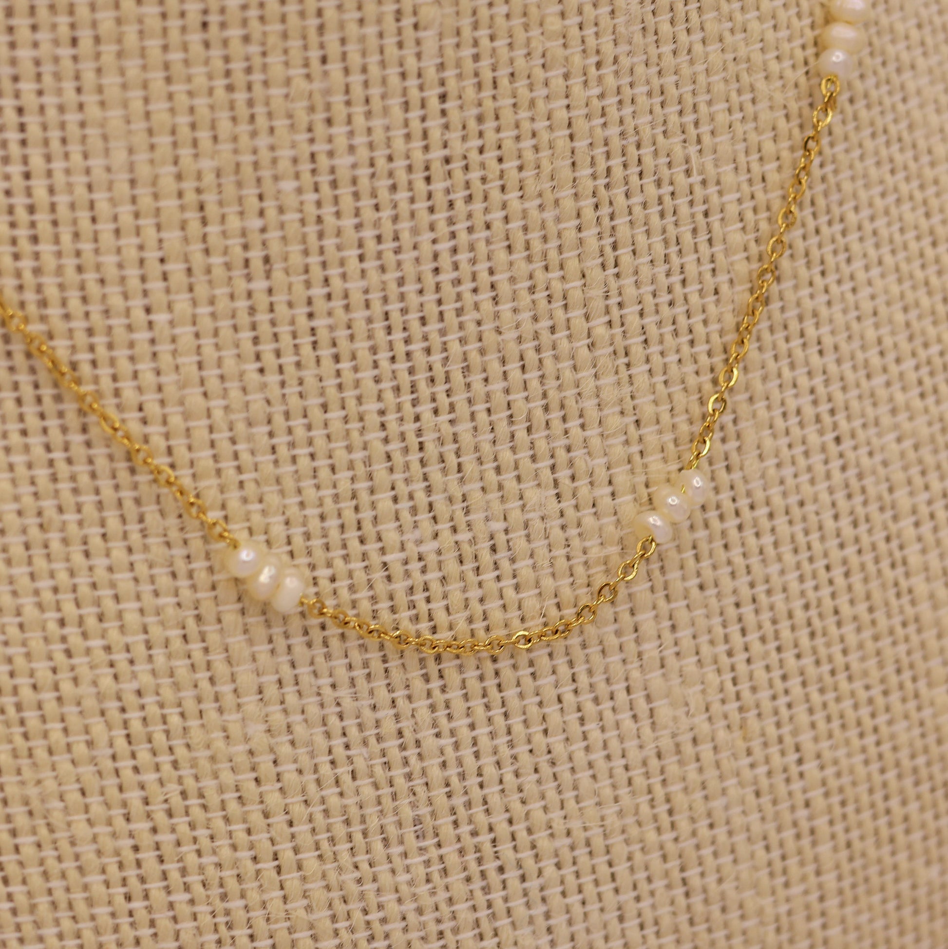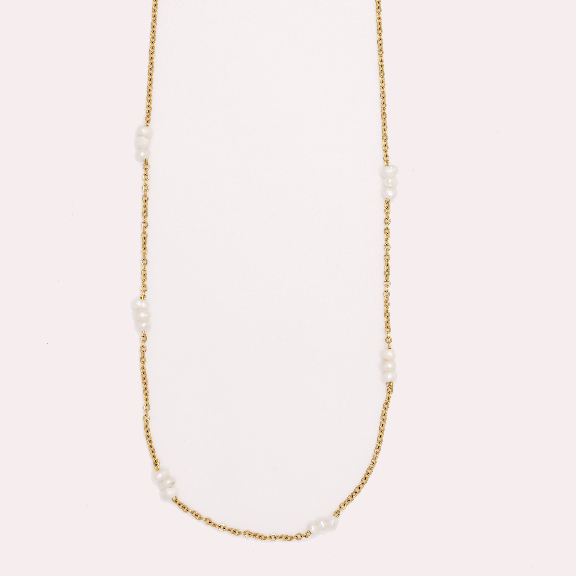 This necklace features a dainty gold-plated chain that delicately drapes around your neck, adding a touch of luxury to your look. The centerpiece of the necklace consists of six sections adorned with miniature pearls, each meticulously placed to create a visually stunning effect. The pearls, with their iridescent luster, symbolize purity and grace. The Joni Necklace is a versatile accessory that can be worn for both casual and formal occasions, making it a perfect addition to your jewellery collection.