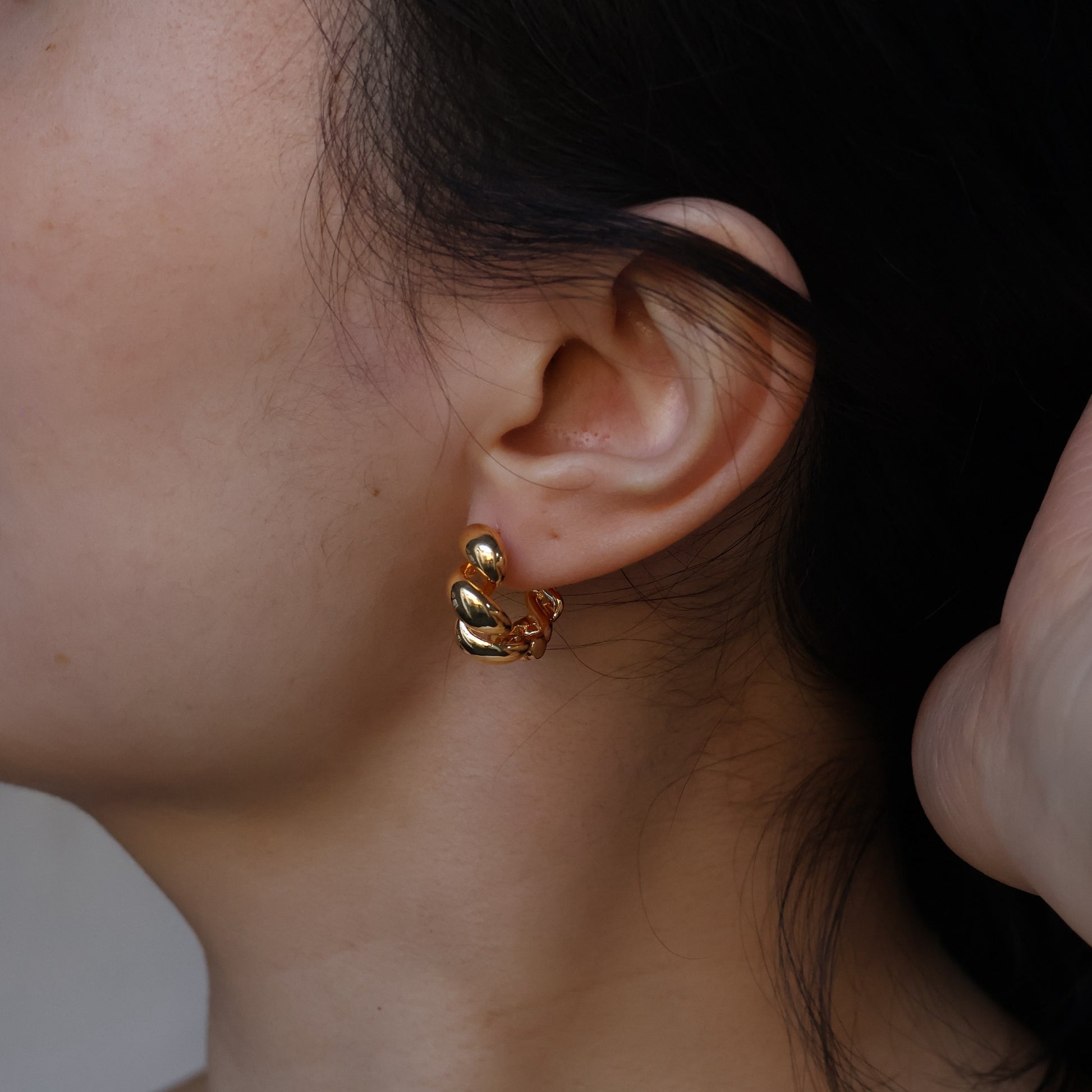 These stunning twisted gold-plated huggies are designed to capture attention with their unique charm. Available in both gold and white gold colors, Quinn embraces a gender-neutral appeal that transcends boundaries. Its intricate twists exude a sense of refined style, perfectly complemented by the warm radiance of gold or the sleek sophistication of white gold. With their comfortable huggie design, Quinn earrings effortlessly enhance any ensemble, adding a touch of understated glamour.