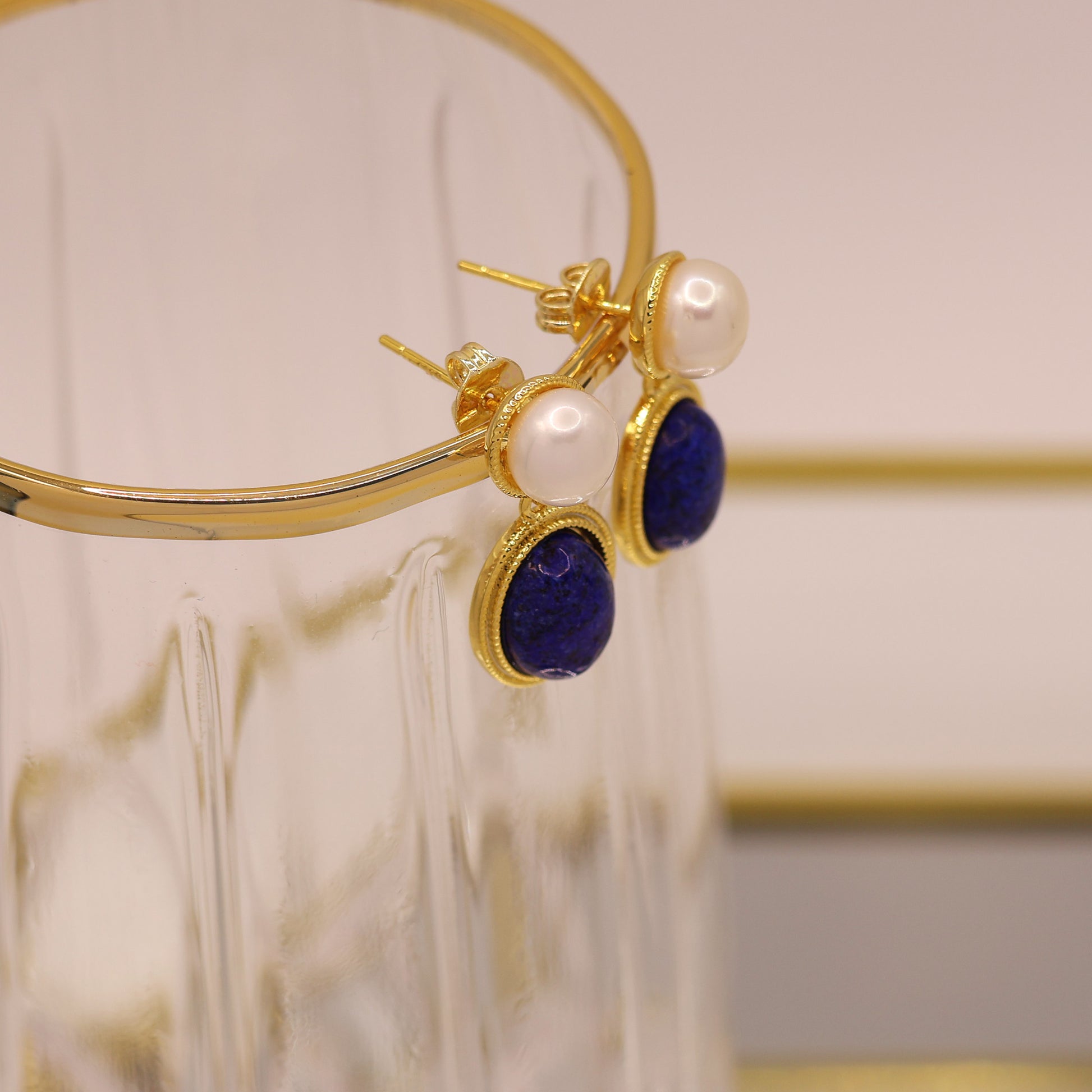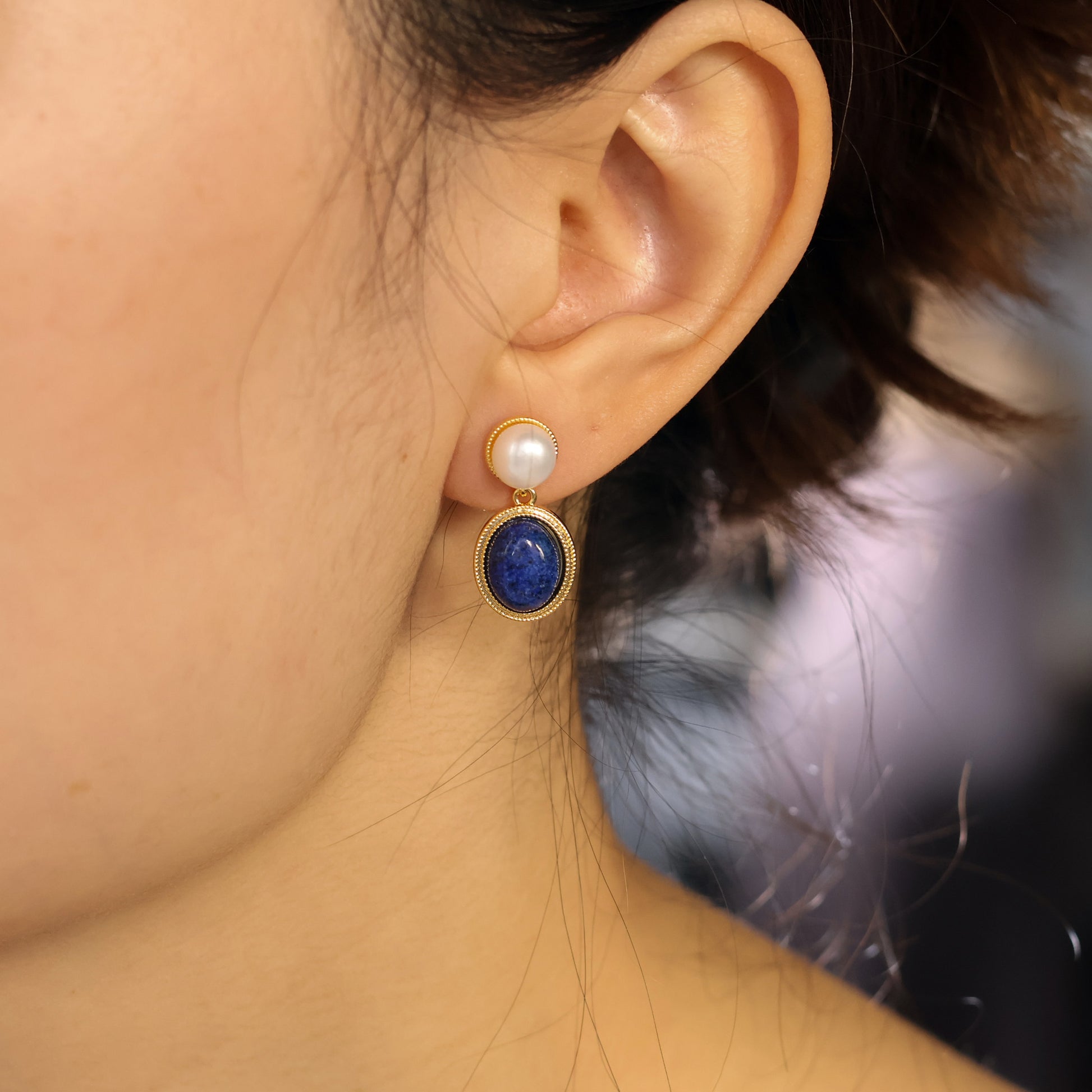 These exquisite vintage-inspired pearl earrings showcase a timeless design that is both elegant and sophisticated. Adorned with lustrous freshwater pearls, they evoke a sense of classic beauty. Adding a touch of vibrant color, the earrings feature Lazurite gemstones, renowned for their deep blue hues and captivating allure. The combination of pearls and Lazurite creates a harmonious blend of elegance and charm. With their vintage-inspired design and captivating gemstone accents, these earrings are the perfect accessory to elevate your style and make a statement.